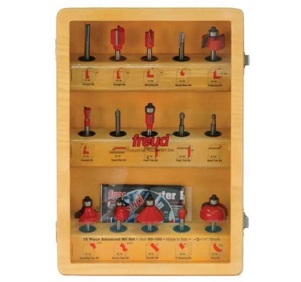 Freud 13-Piece Router Bit Set 91-100 TiCo Carbide Tips Flush Trim Chamfer Cove Dovetail V-Groove Display Case