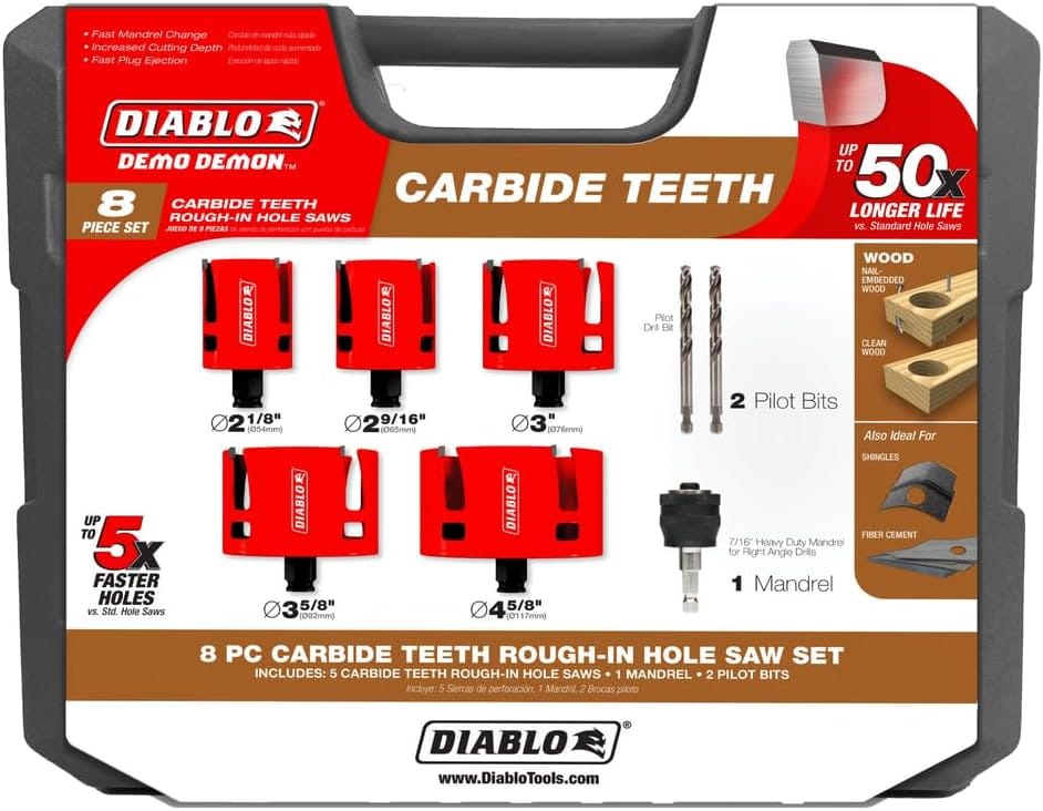 Engineered for aggressive performance and unmatched durability, the Diablo Demo Demon® Carbide Teeth Rough-In Hole Saw Set (8-Piece) is built to dominate nail-embedded wood, shingles, fiber cement, and clean wood. With up to 50x longer cutting life and 5x faster hole creation, this set is a game-changer for contractors, electricians, and remodelers who need speed and reliability on every job.
