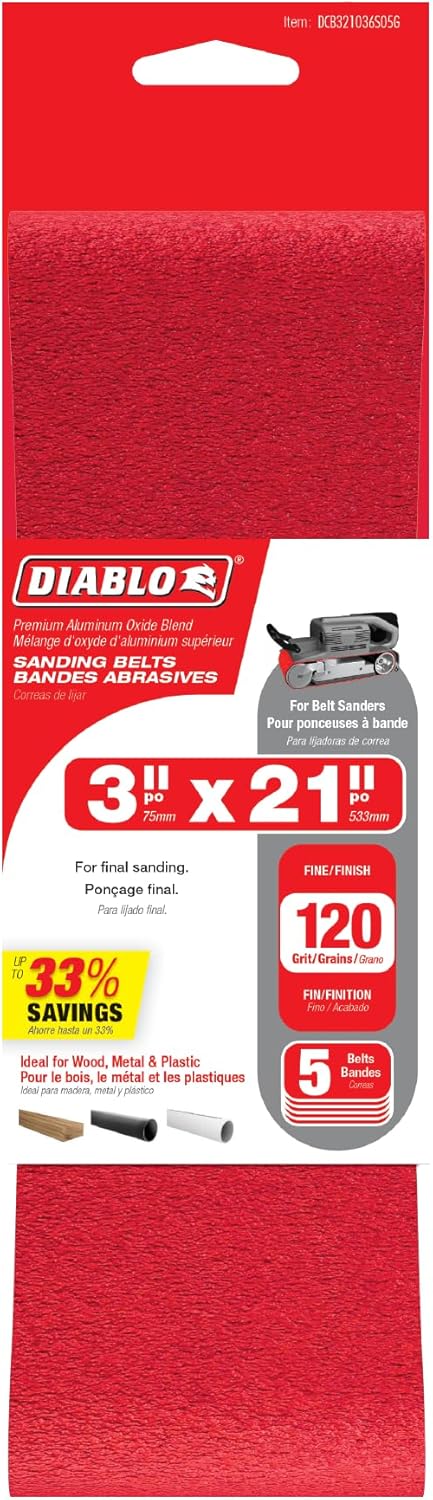 Diablo Sanding Belt for Belt Sanders in Wood, Metal and Plastics - 3" x21", 120-Grit, Fine, Zirconium Blend, 5-Pack - DCB321120S05G