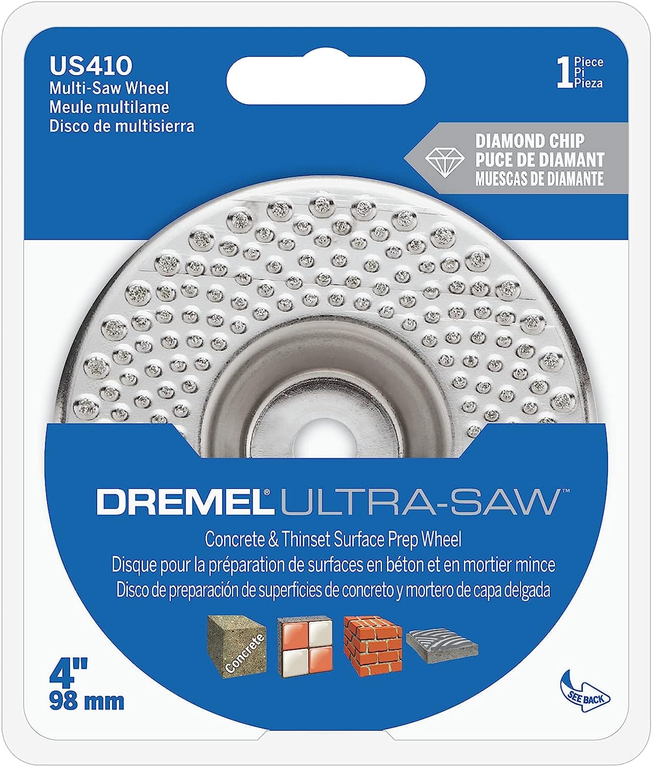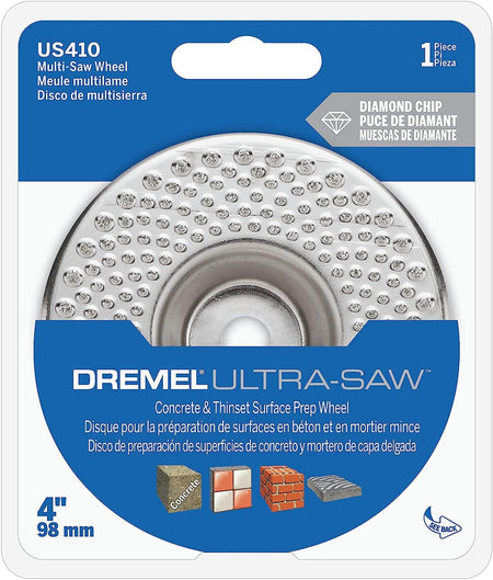 Use your Dremel Ultra-Saw for concrete, masonry and tile surface preparation. The US410 diamond surface prep wheel uses patented diamond embedding technology to quickly smooth bumps and cracks in concrete before finishing and to remove thinset mortar for tile remodeling. Four In. diameter wheel.