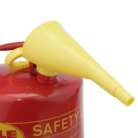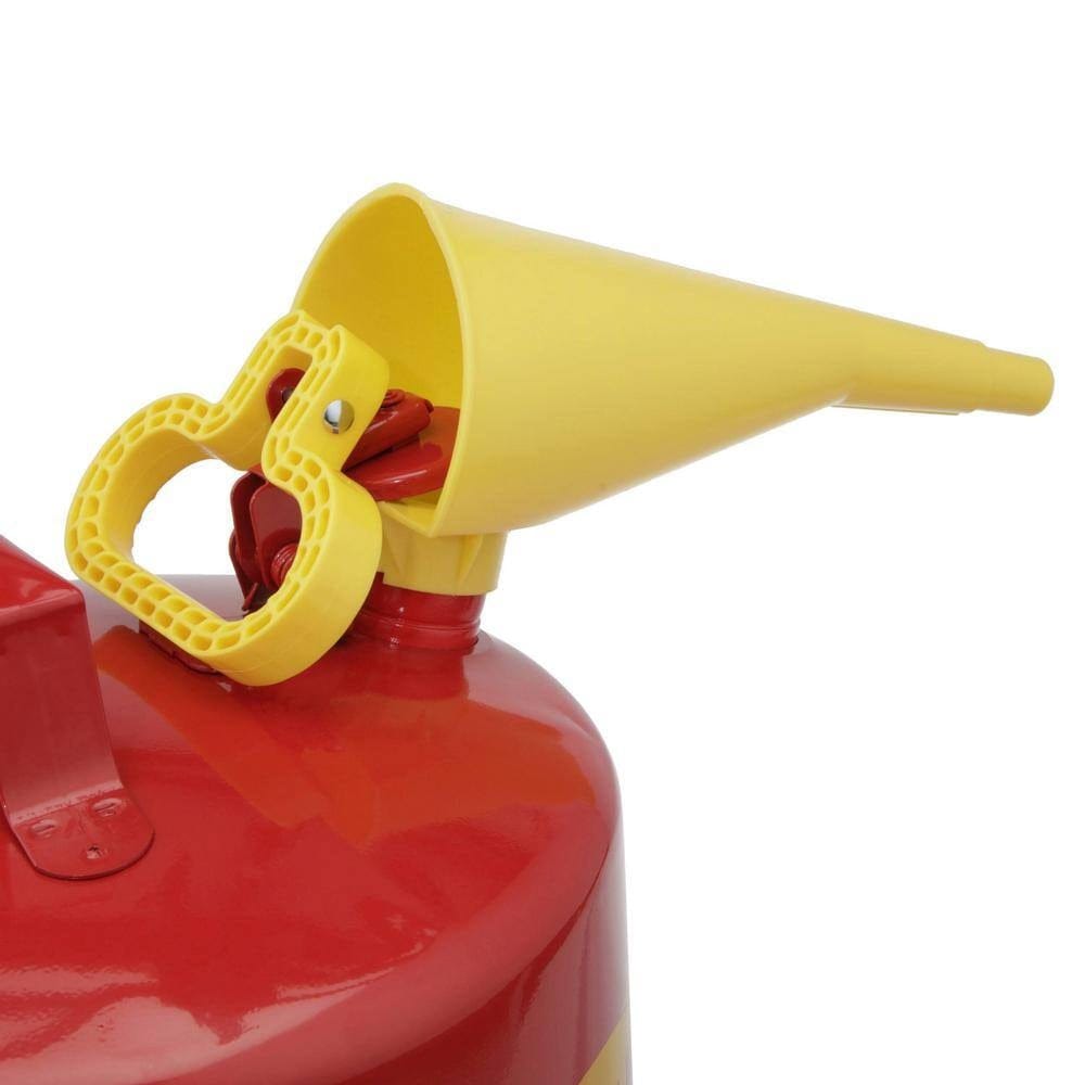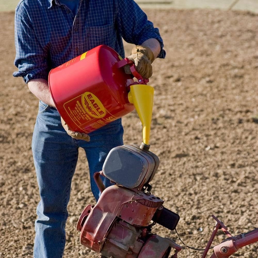 Engineered for maximum user protection and daily ease of use, the Eagle UI50FS comes fully equipped with a built-in, non-sparking flame arrester that safely dissipates heat to prevent accidental ignition and explosions. The self-closing, double-interlocked lid incorporates an automatic nitrile gasket that intelligently vents internal pressures between 3 and 5 PSI, safeguarding against extreme pressure ruptures. For smooth, spill-free pouring into smaller engine tanks, the included F-15 funnel attachment fastens quickly and securely over the 1.65-inch pour spout. Paired with its ergonomic comfort-grip trigger release and a sturdy fixed steel carrying handle, your employees can refuel equipment effortlessly without unnecessary wrist strain.