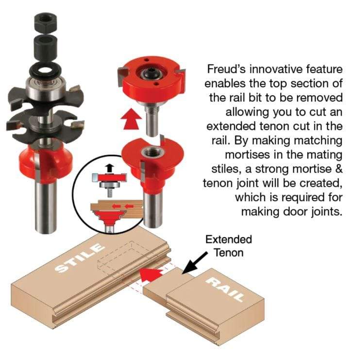 Freud's unique Premier Adjustable Rail and Stile System builds perfect doors in material from 5/8" to 1-1/4" thick, and also features Freud's patented technology for producing extra-strong long tenon joints. The System also includes adjustable shims to adjust the panel groove from 7/32"(5.5mm) for thinner plywood panels to 3/8" (9.5mm) thick for larger solid wood raised panels. Offered in five different profiles to suit any project! For even more versatility, add optional cutters to produce double-sided doors, or the optional cutter for glass and screen door construction. Use in table-mounted routers to mill and hardwood or softwood.