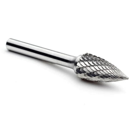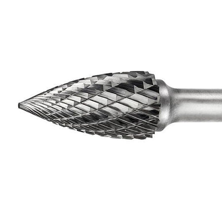When you need to clean out a sharp corner or get into a tight V-cut, a standard cylindrical burr just won't do it. The UCT Gem Carbide SG-3 is the specialty tool for the job. Its 3/8" "pointed tree" (or flame) shape is perfect for getting into acute-angled grooves, deburring complex shapes, and contouring inside welded joints. The double-cut (cross-cut) flutes provide smooth, controllable grinding and a fine finish, breaking down tough steel and metal into small chips.